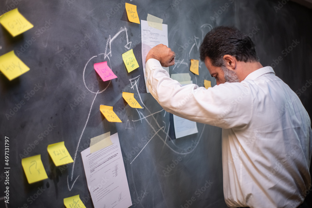Focused businessman thinking over new project. Man in shirt standing near blackboard with writings and paper notes on it. Business, job, work concept