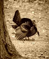 Large male Tom turkey struts through a meadow with all feathers opened