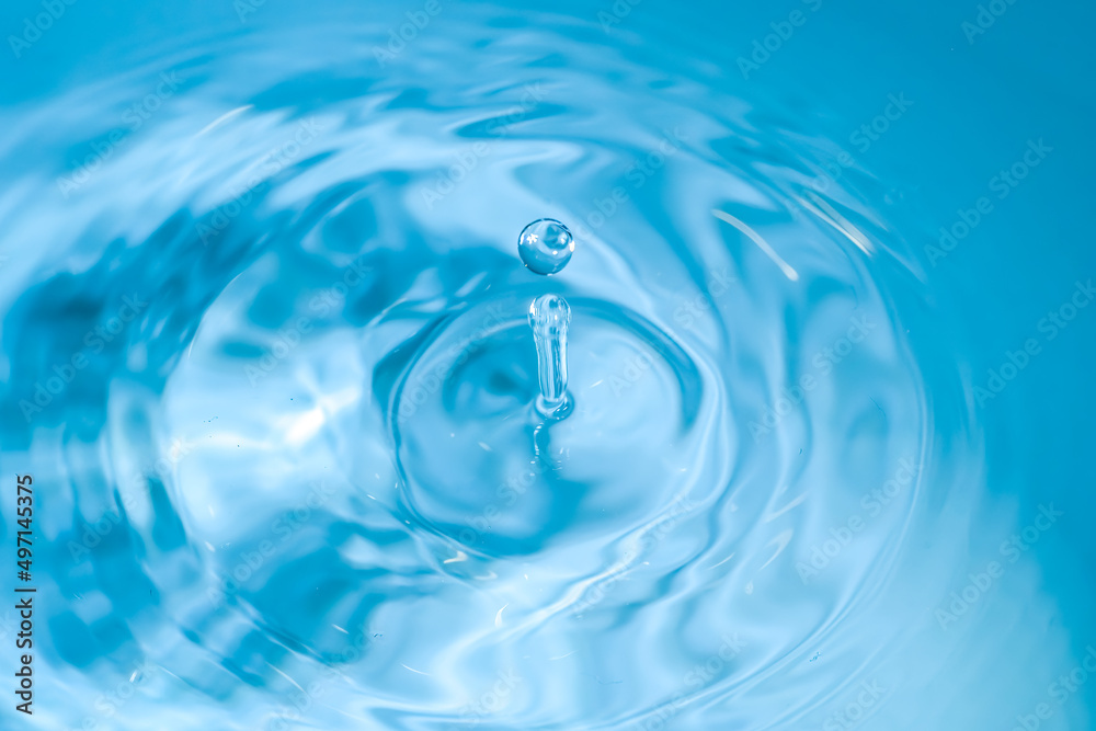 water drop splash blue colored. Round water drop. Water drop in glass. Drops, splashes, spray, abstract shapes out of the water