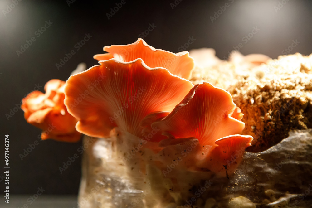 Oyster mushrooms grown on a substrate at home from mycelium. Dark background.