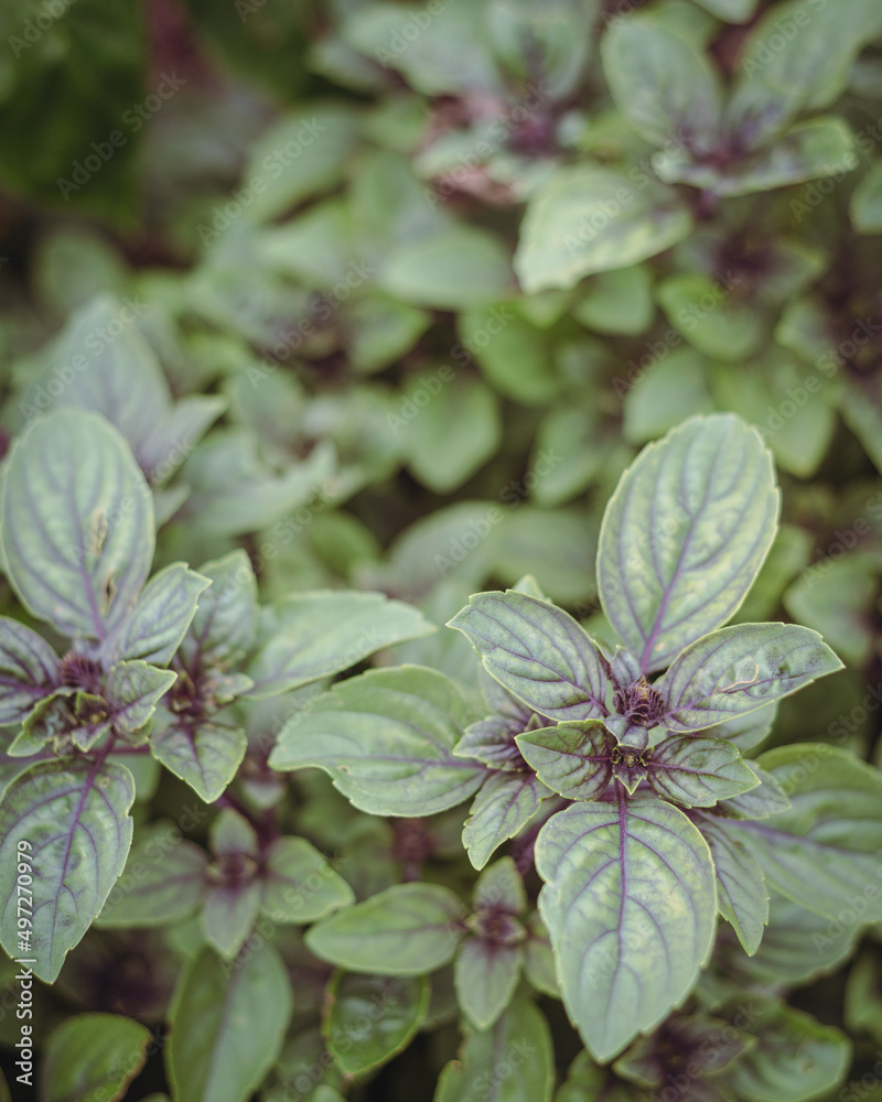 Filtered photo African blue basil (ocimum kilimandscharicum), hybrid of camphor basil and dark opal basil blooming at backyard garden in Dallas, TX