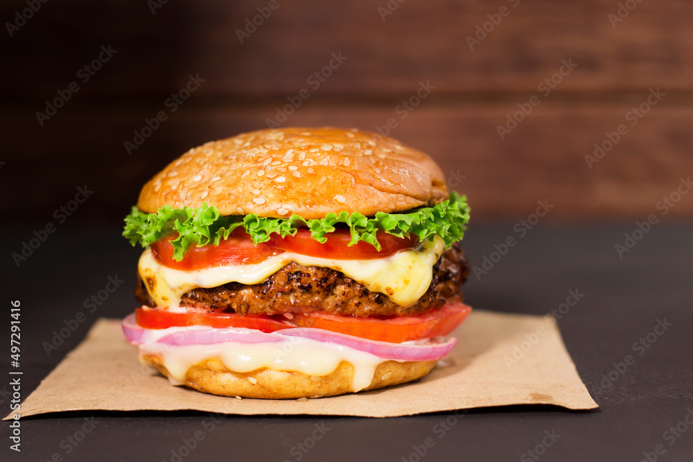 Close-up of delicious homemade burgers on a wooden table on a dark background beef hamburger freshly cooked delicious