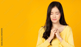 Young asian millennial woman hold hands on heart chest Beautiful girl get grateful and thankful Happy lady show gratitude, love and care, pray or make a wish Religion and faith concept She closed eyes