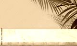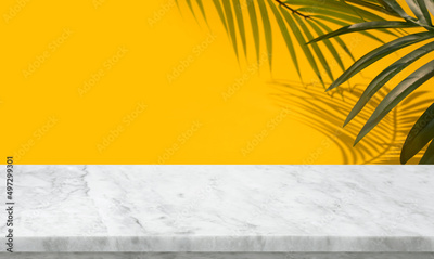 Selective focus.Nature product display with marble table counter on palm leaf color background