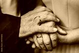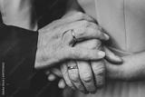 Senior woman and man hold hands with each other, retirement life. Elderly community concept, closeup. Elderly couple together outdoors. Focus on hands. Close up. Black and white photo.