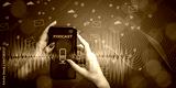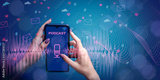 Women's hands with a smartphone with microphone icon and inscription PODCAST on background of graphic icons of likes, letters, hashtags. Concept of blogging, virtual communication, social networks