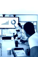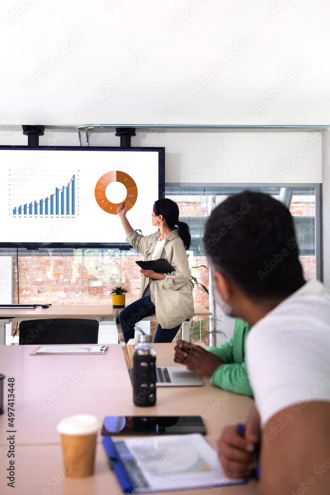 Team business meeting. Female boss looking at company results graphics. Vertical image.