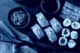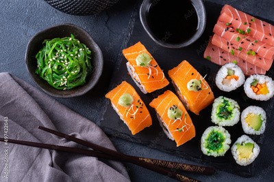 Vegan Sushi, Sashimi and Maki Rolls with Plant based seafood
