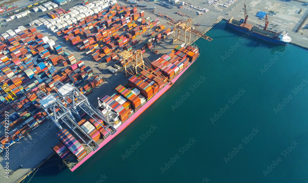 Arial view by drone camera transportation logistics and container dock cargo yard with working crane bridge in shipyard with transport logistic import export with blue sky background
