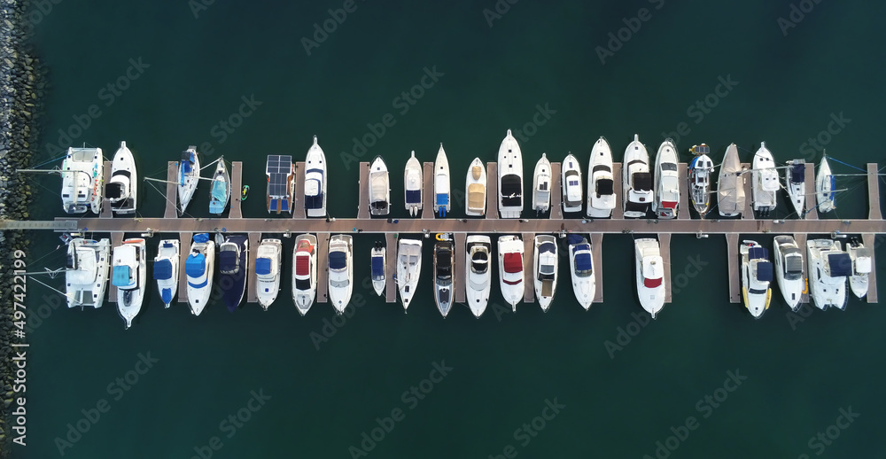 Aerial top view a lot of Yacht and sailboat are moored at the quay. Yacht and sailboat most popular tourist attractions on the beach in vacation trip