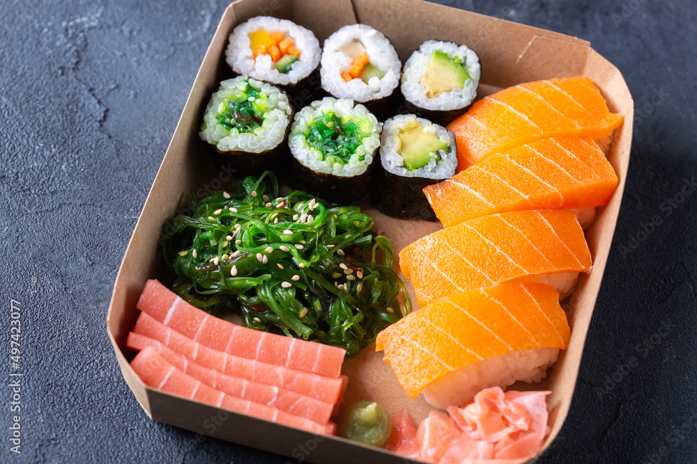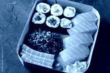 Vegan Sushi, Sashimi and Maki Rolls with Plant based seafood