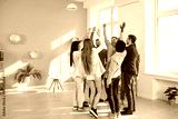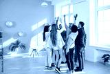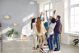 Happy diverse business team celebrating success and having fun all together. Group of cheerful ecstatic people standing in circle in modern office high five each other and shout Yes we did it, Hooray