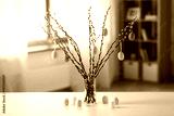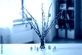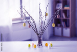 holidays and object concept - pussy willow branches decorated by easter eggs in vase and candles on table at home in violet shades over festive lights