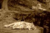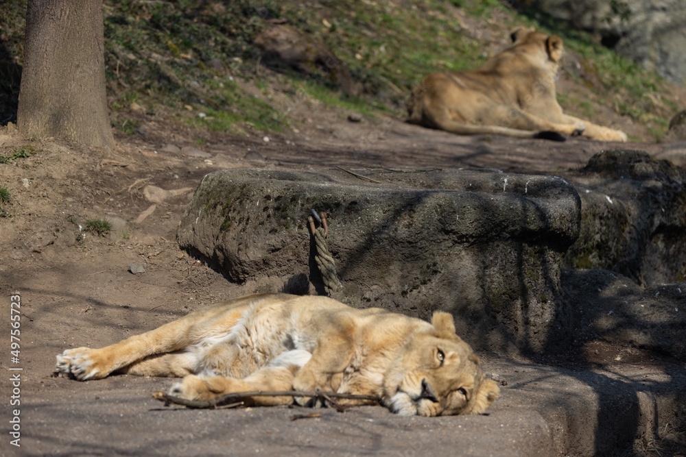 An Asiatic lioness, also known as Panthera leo persica, sleeps peacefully on a rock. The lion is such a big cat of prey.