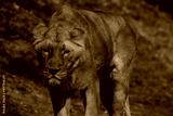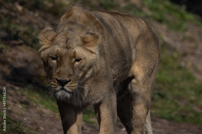 A lion walks comfortably through the steppe landscape and watches the other animals to plan an attack so that he can eat something again.