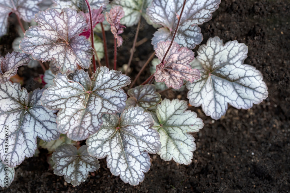 Silvery leaf heuchera with dark red veins in the spring. Gardening, hobbies, perennial flowers, landscaping.