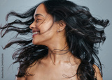 Her hair has natural bounce and great volume. Studio shot of an attractive young woman tossing her hair against a grey background.