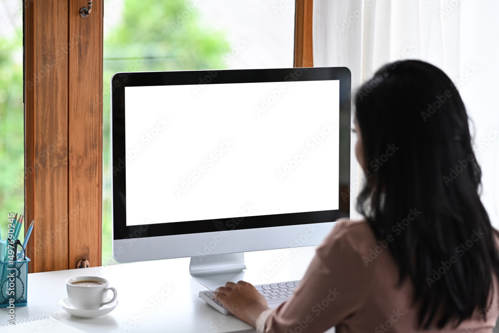 Rear view of creative woman working with modern computer at her workplace.