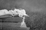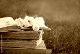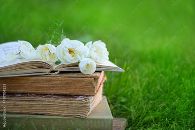 old books and white roses flowers, natural green background. Hobbies on vacation, love of reading, Literature and knowledge concept. inspiration atmosphere image. harmony, peaceful mood