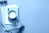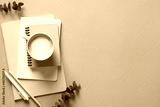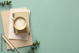 Stack of notebooks, cup of coffee and office supplies on a green background with eucalyptus leaves. Modern home office desk table. Flat lay, top view.