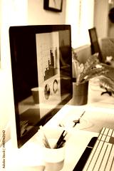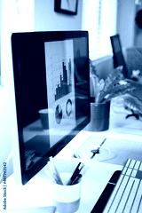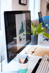 A desktop computer screen with a bar graph and pie chart in blue