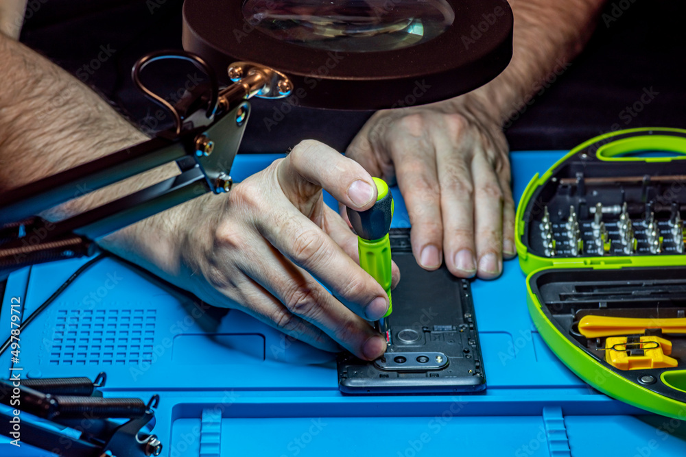 Service and repair of phones and gadgets. Hands of a master with a screwdriver repairing a smartphone. Tool collection, magnifying loupe, workshop work environment