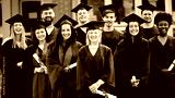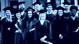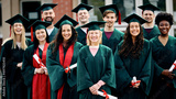 Portrait of multiracial college graduates in their gowns looking at camera.