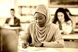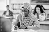 Black Muslim woman writes an exam in classroom at the university.
