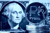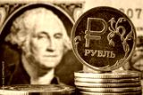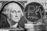 Money of USA vs Russia, ruble coin on background of one dollar bill