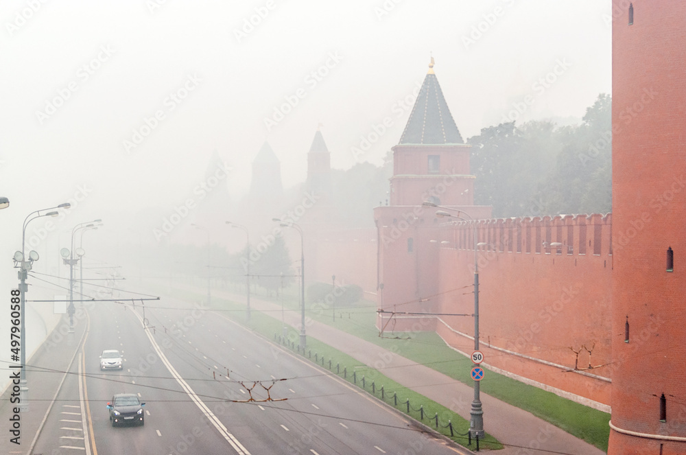 Moscow Kremlin in mist, Russia. Moscow city center in foggy morning