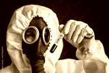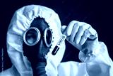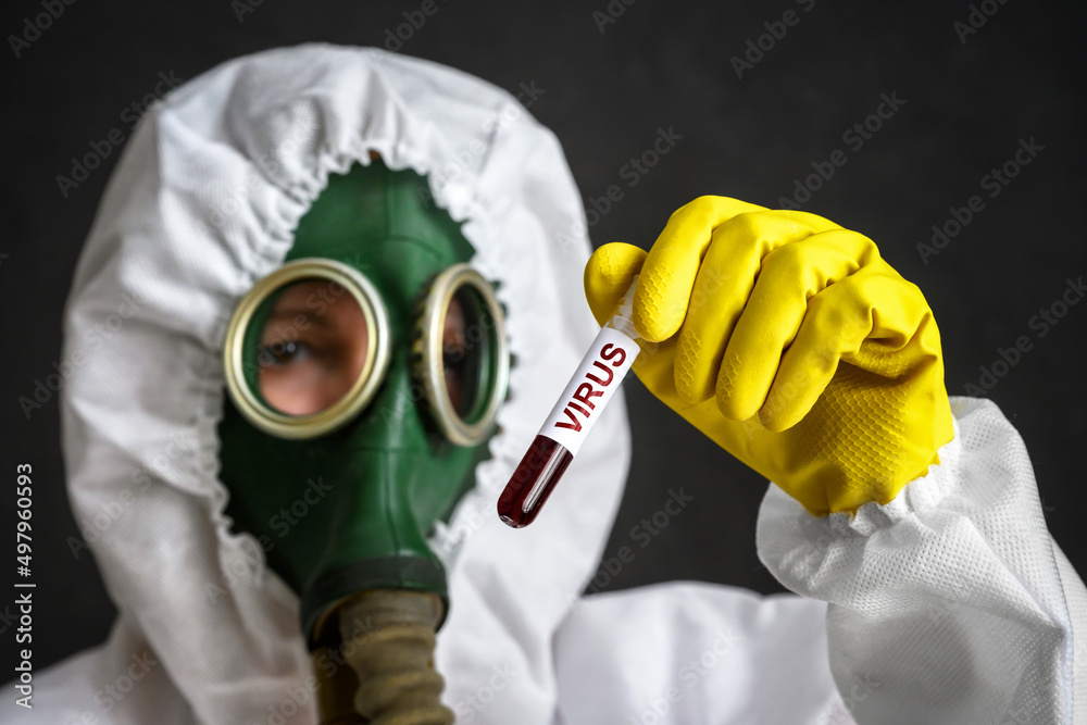 Test tube with virus in hands of scientist in lab. Biological weapon and secret research concept.