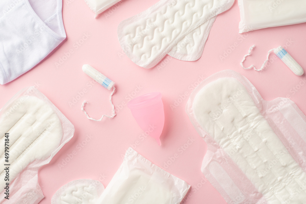 Top view photo of sanitary napkins lingerie menstrual cup and tampons on isolated pastel pink background