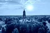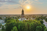 Old bell tower in a provincial town in Russia, summer at sunset, aerial view.