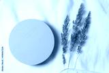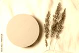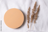 Blank pastel round platform podium for cosmetics or products and dry grass plant on white linen fabric background. Top view
