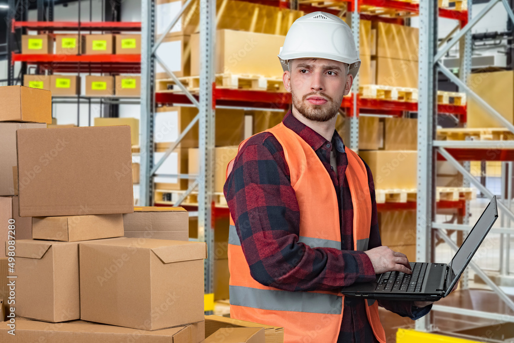 Man customs officer. Warehouse employee. Guy in orange vest and white helmet. Customs officer next to boxes. Concept of customs clearance services. Warehouse worker at state border.