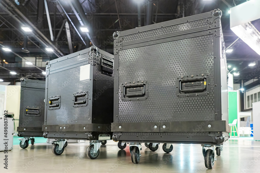 Case for musical equipment. Suitcases on wheels for concert instruments. Several cases for concert equipment stand nearby. Concept of renting sound equipment for events. musical instruments
