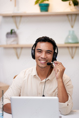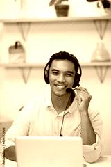 A young Asian man holds the microphone of his headset and smiles at the camera