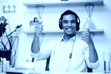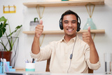 A young Asian man holds thumbs up while wearing a call centre headset in office
