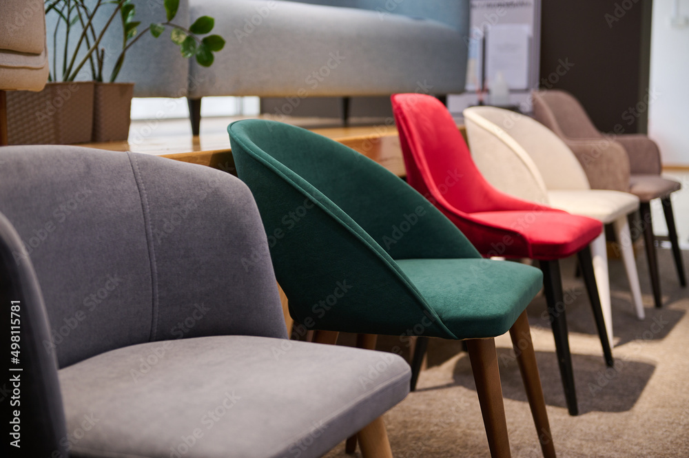 Close-up, Chairs in salon of furniture. Showroom, exhibition hall of modern soft furniture, upholstered furnitures