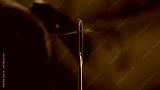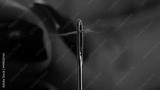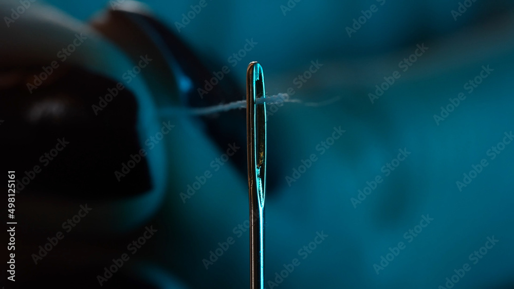 a woman's tailor hand insert With sewing thread in a needle hole. fabric cloth concept, needlework, craft object
