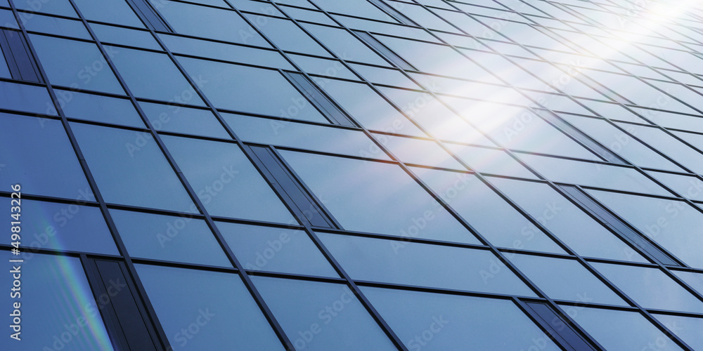 bright sun shines on large corporate building wall with panoramic windows reflecting blue skyscape on summer day