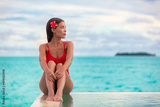 Luxury resort travel vacation natural beauty picture by idyllic overwater bungalow villa. Woman relaxing by infinity pool. Social media influencer traveler luxurious high end lifestyle