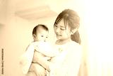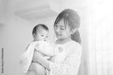 明るいリビングで赤ちゃんを抱っこしあやすお母さん