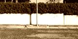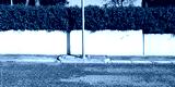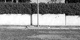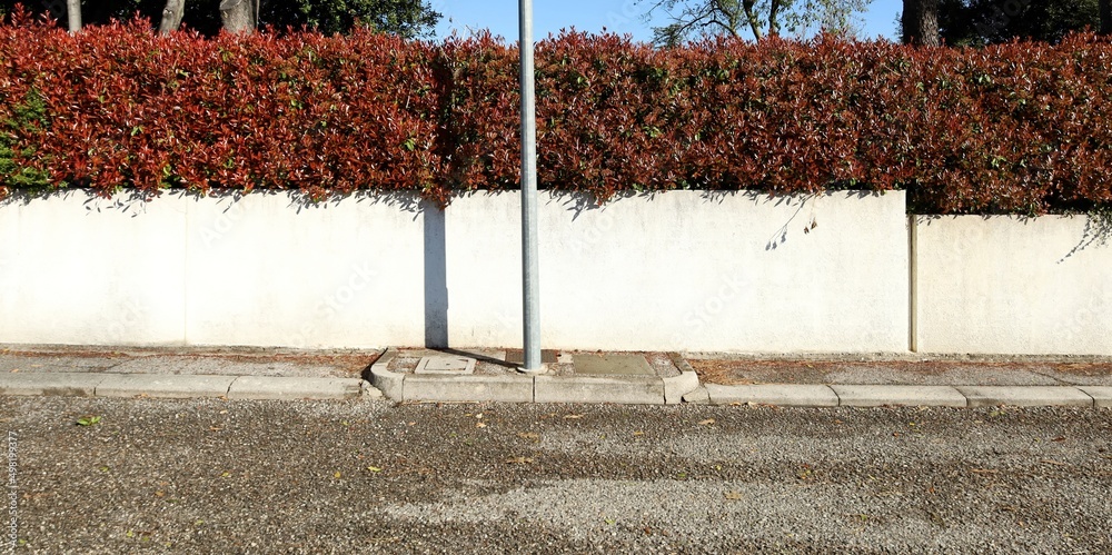 House fence consisting of a white plaster wall and a red leaves hedge above. Asphalt sidewalk and paved street in front. Background for copy space
