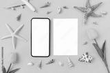 Summer time concept, Smartphone mockup screen with blank paper for advertising signs and beach accessories on the yellow background.