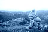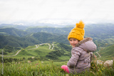 happy child girl in yellow hat sits on background of nature - mountain landscape. travel with kids.