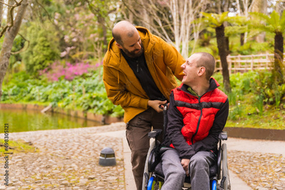 a person with a disability in the wheelchair being pushed by a friend in a public city park, having fun in spring