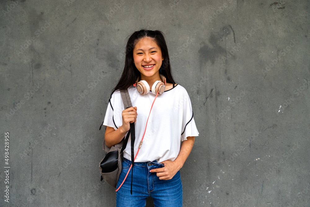 Smiling teen Asian high school student girl standing outdoors looking at camera.