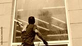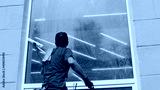 An employee of a professional cleaning service in overalls washes the glass of the windows of the facade of the building. Showcase cleaning for shops and businesses