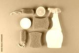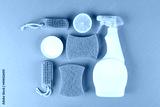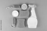 Organic household cleaners set made of natural ingredients, bamboo brush, organic dishcloth, lemon, baking soda, citric acid and spray bottle with cleaning liquid on beige background. Mockup